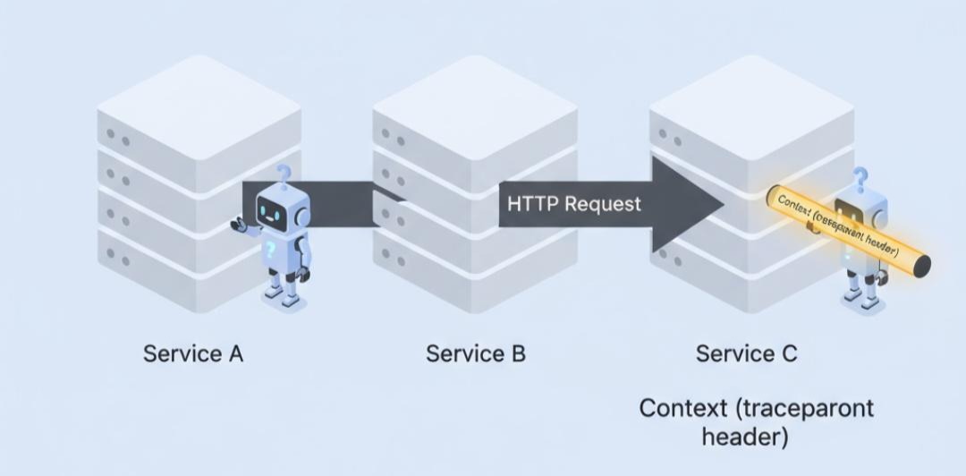 - 工作流程(以HTTP为例):a. Service A(Client)的OTel探针,在发送HTTP请求前,从当前上下文中获取Trace信息,生成traceparent头,并注入到HTTP Headers中。b. Service B(Server)的OTel探针,在收到请求时,检查HTTP Headers,如果发现traceparent头,就将其提取出来,作为当前新线程的上下文。