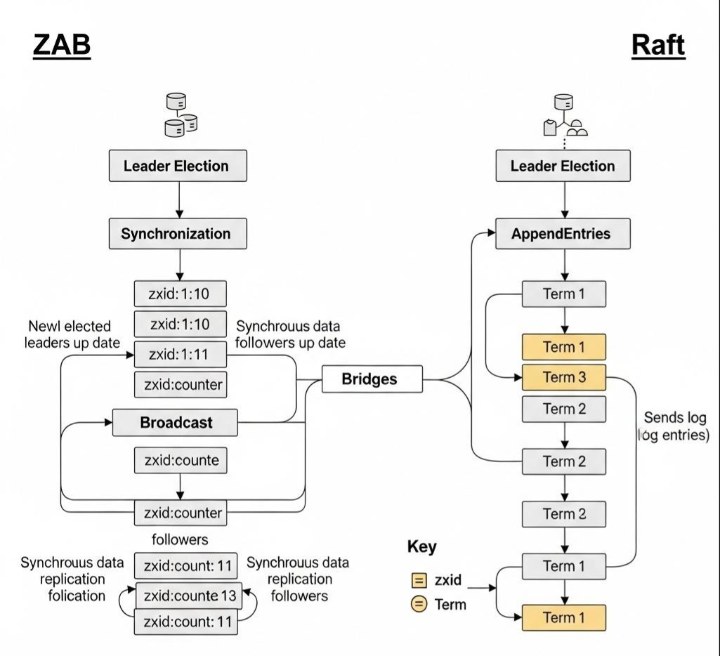 在Raft诞生之前,分布式协调领域事实上的霸主是ZooKeeper。它使用的共识协议,叫做ZAB(ZooKeeper Atomic Broadcast)。有趣的是,ZAB协议的思想,与Raft惊人地相似,可以看作是Raft的“异父异母的孪生兄弟”。